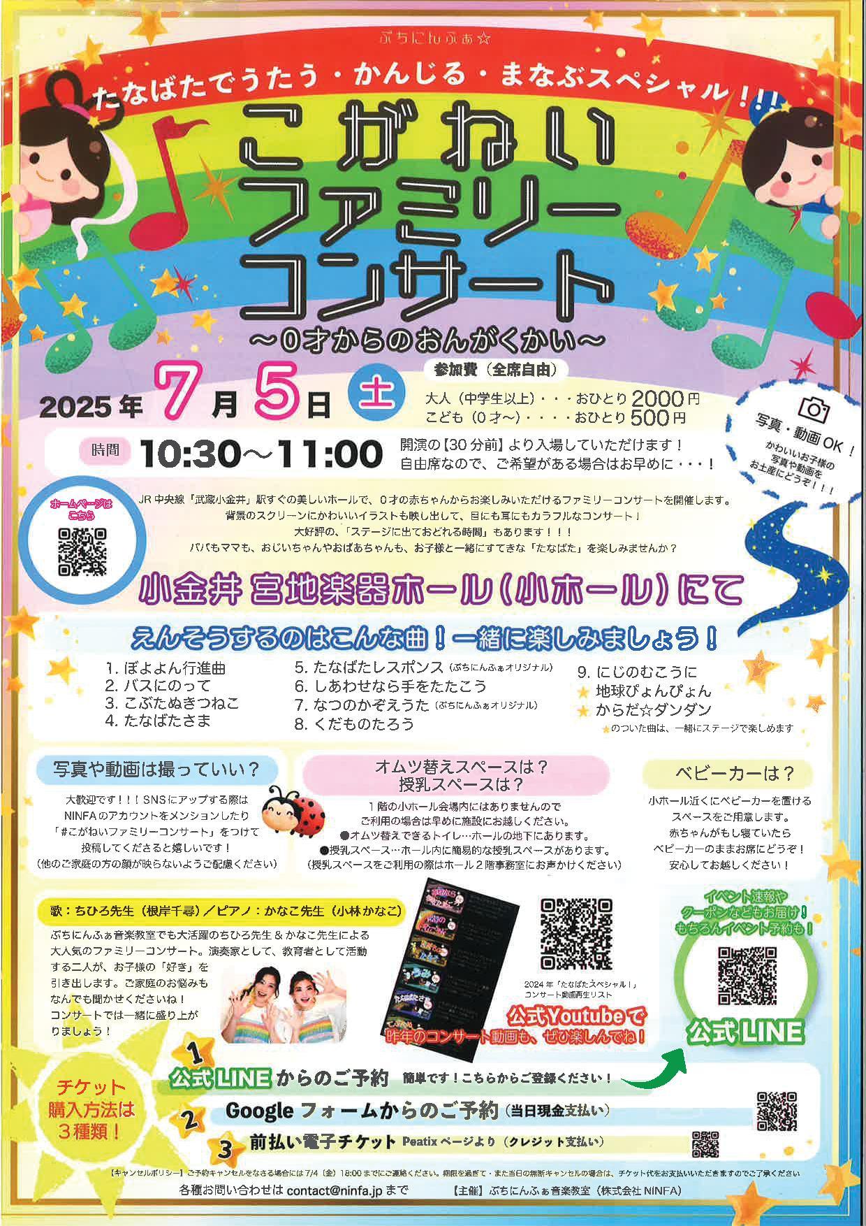 - Art×Experience×Learning NINFA presentsこがねいファミリーコンサート ~0才からのおんがくかい~たなばたで うたう・かんじる・まなぶスペシャル!!!