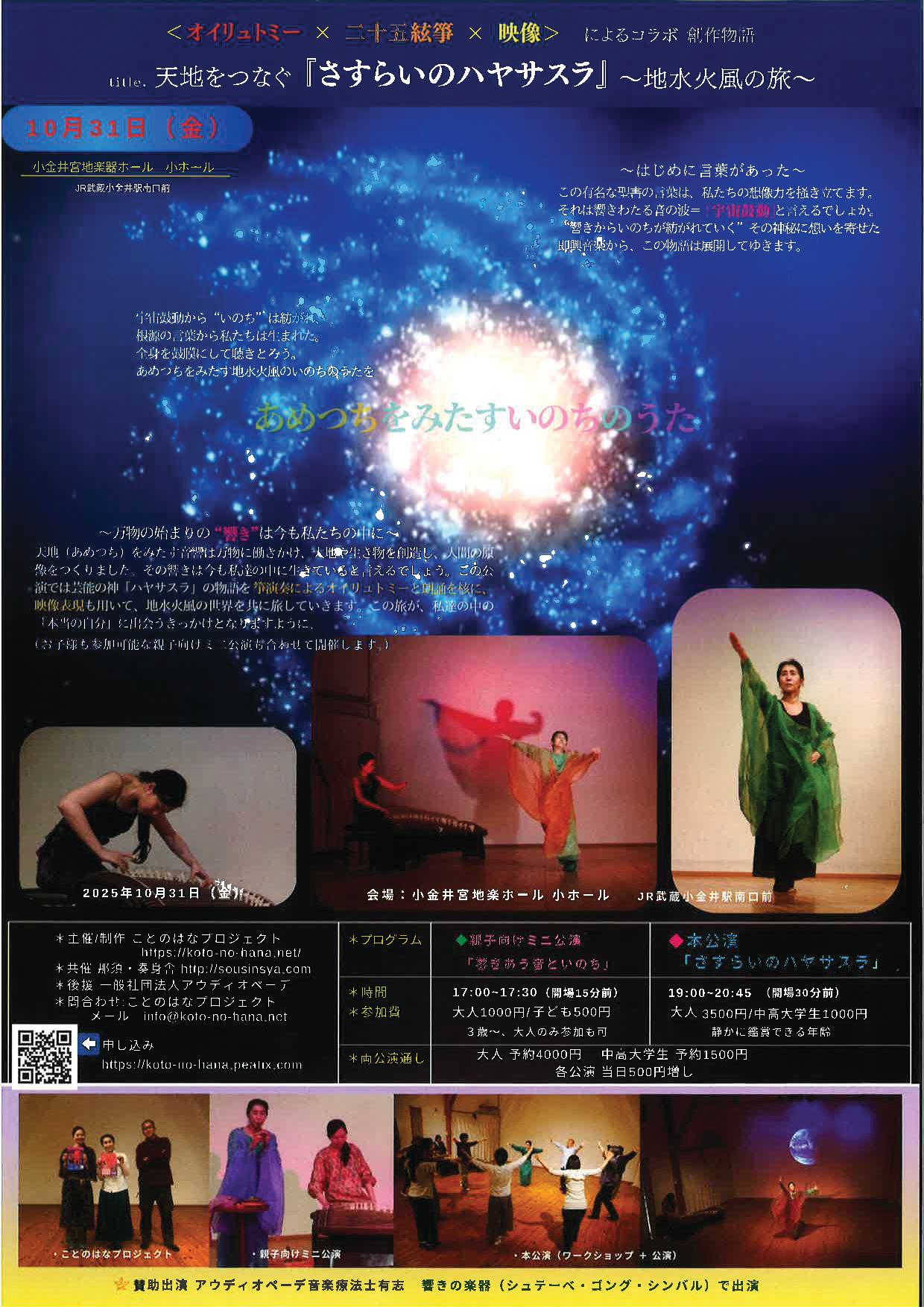 出演者 | オイリュトミー 渋谷智栄子 箏、二十五絃箏 瑠璃 映像、タムタム 近清 武 アウディオペーデ音楽療法士 有志の皆さま |