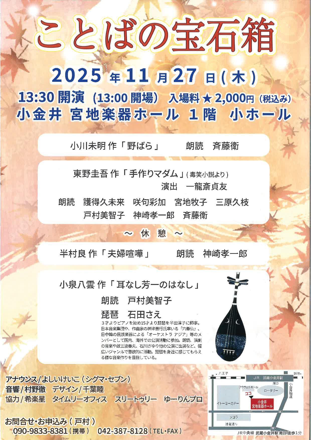 プログラム | 小川未明作「野ばら」 東野圭吾作「手作りマダム」 小泉八雲作「耳なし芳一のはなし」 |