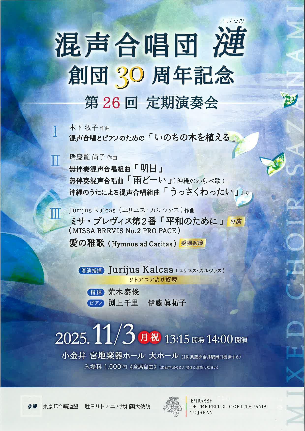 プログラム | Ⅰ.木下牧子作曲「いのちの木を植える」 Ⅱ.瑞慶覧尚子作曲「明日」「雨どーい」「うっさくわったい」より Ⅲ.Jurijus Kalcas作曲 ミサ・ブレヴィス第2番「平和のために」 愛の雅歌 |
