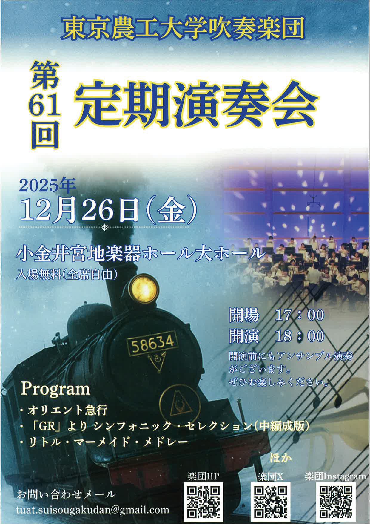 | お問合せ | 東京農工大学吹奏楽団 E-mail tuat.suisougakudan@gmail.com HP tuatwo.sakura.ne.jp |