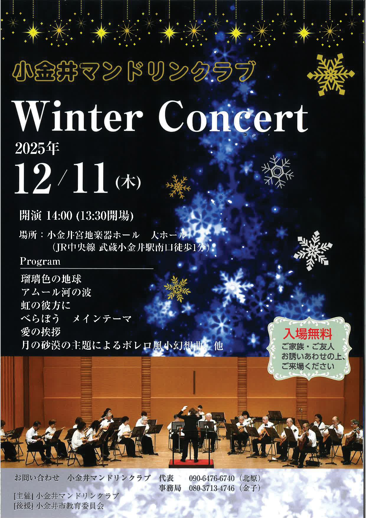 | お問合せ | 小金井マンドリンクラブ事務局 TEL 090-6476-6740[北原] |