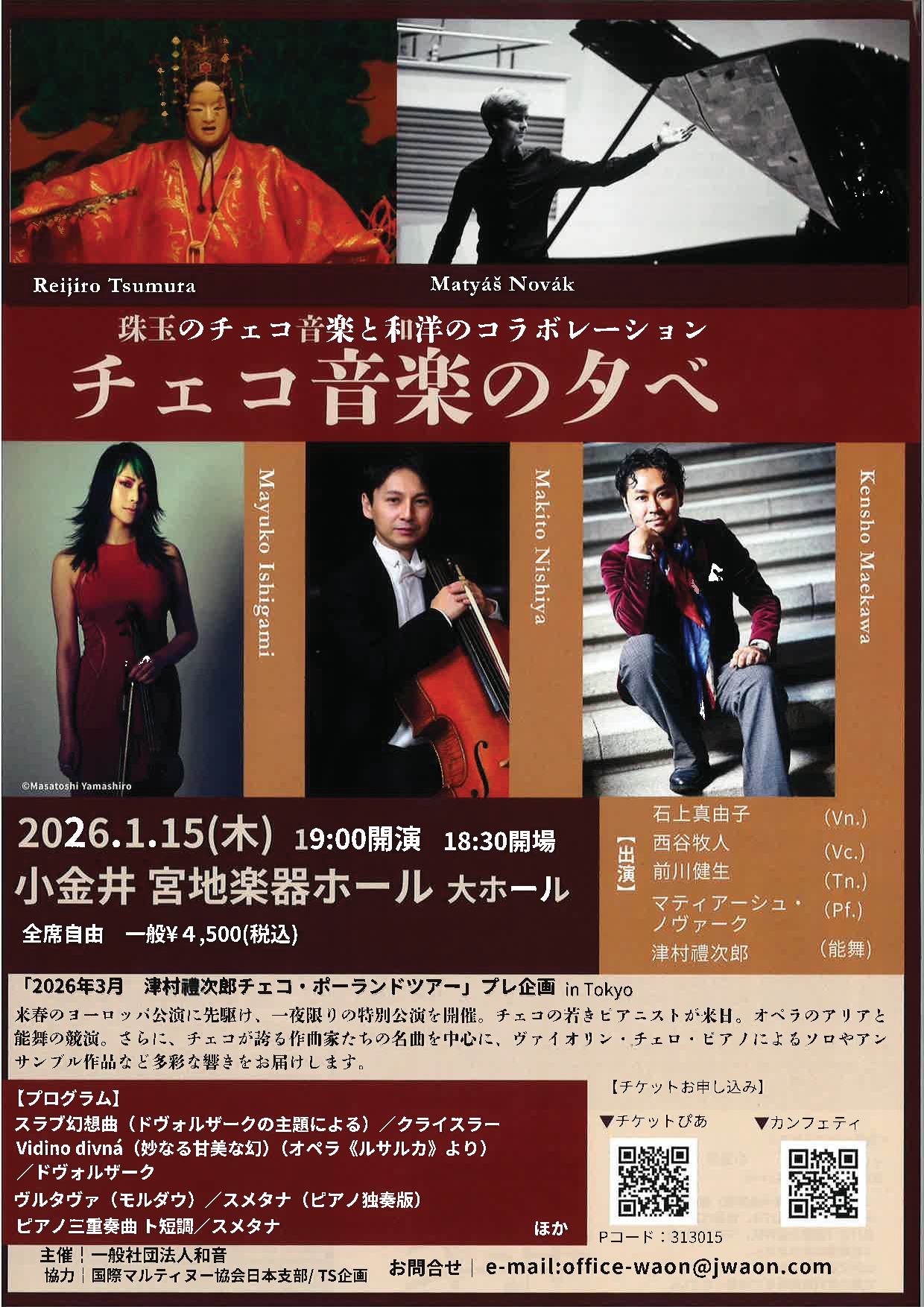 | 出演者 | 石上真由子(ヴァイオリン) 津村禮次郎(能舞) 西谷牧人(チェロ) 前川健生(テノール) マティアーシュ・ノヴァーク(ピアノ) |