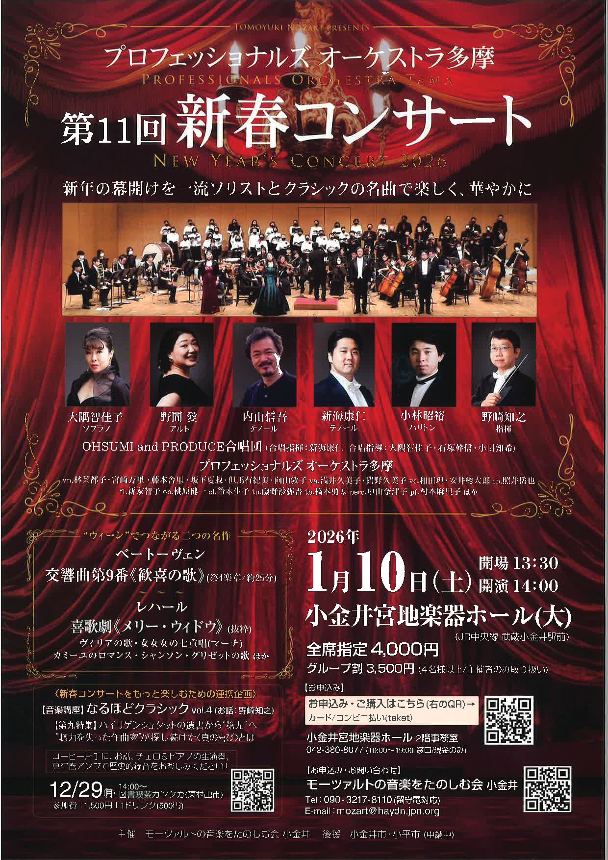 | 出演者 | 大隅智佳子(ソプラノ)、野間愛(アルト)、内山信吾(テノール)、新海康仁(テノール)、小材昭裕(バリトン・司会)、プロフェショナルズオーケストラ多摩、OAP合唱団、野崎知之(指揮) |