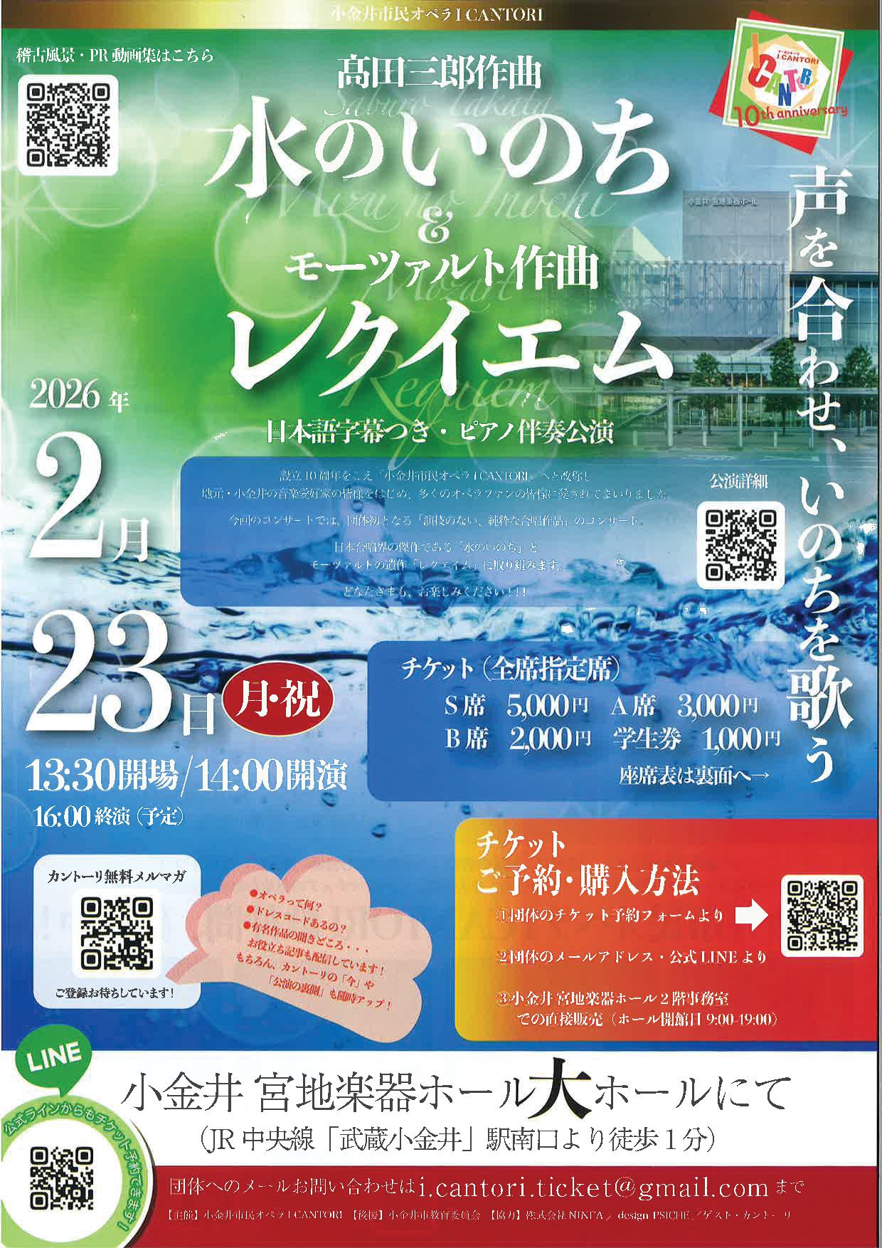 | お問合せ | 小金井市民オペラ I CANTORIチケット窓口 E-mail i.cantori.ticket@gmail.com HP https://icantori.jp/ |