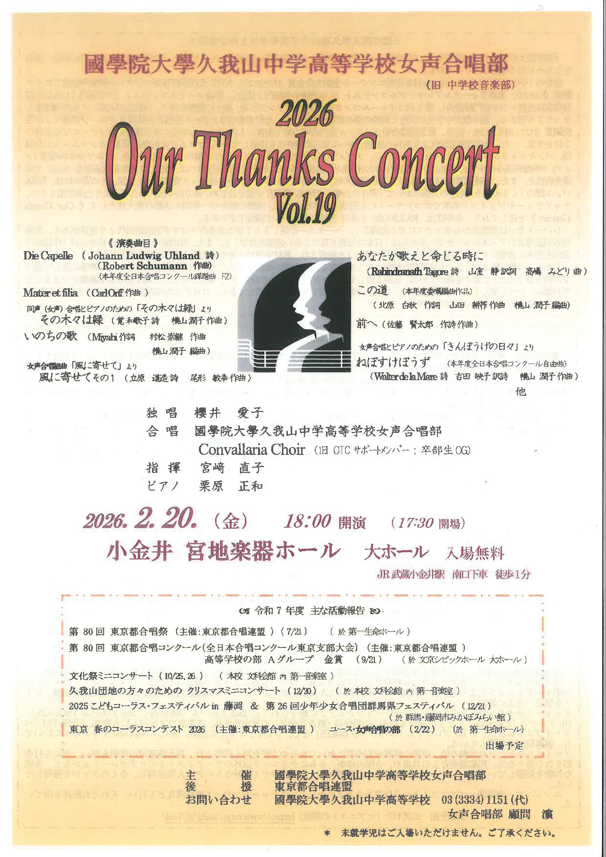 | 出演者 | 独唱 櫻井愛子(ソプラノ) 合唱 國學院大學久我山中学高等学校女声合唱部 Convallaria Choir(卒部有志) ピアノ 栗原正和 指揮 宮﨑直子 |