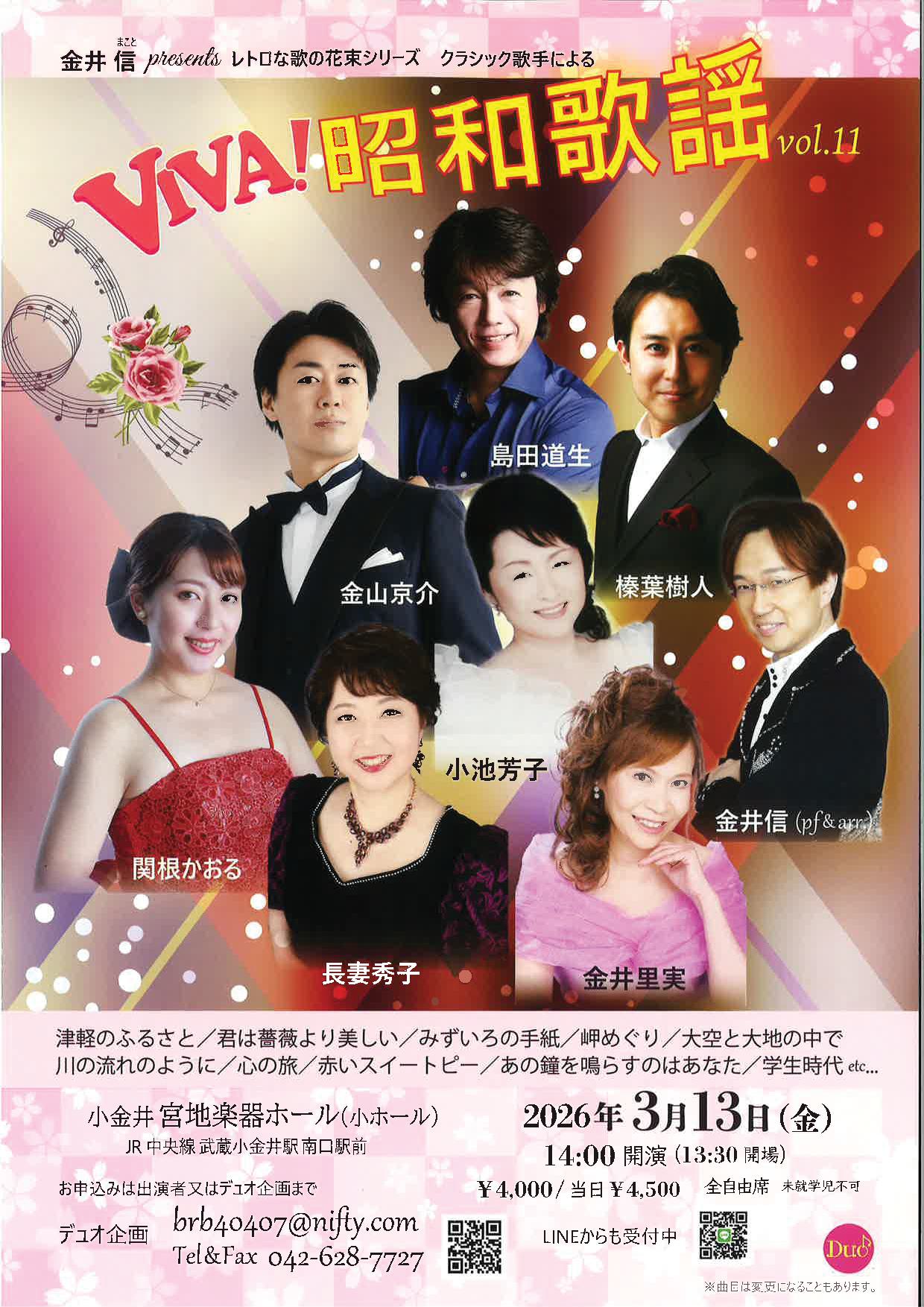 | 出演者 | 榛葉樹人、金山京介、島田道生、小池芳子、長妻秀子、関根かおる、金井里実、金井信(pf) |