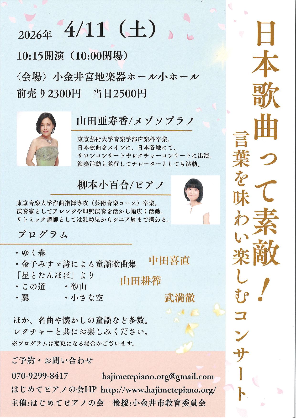 | 出演者 | メゾソプラノ 山田亜寿香 ピアノ 柳本小百合 |